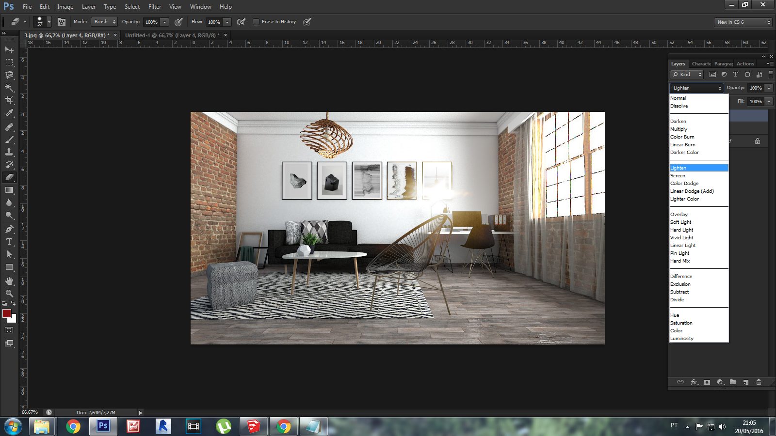 Na pós-produção, o que eu basicamente fiz foi ajustar os níveis e criar o ponto de luz da luminária. Para fazer isso eu peguei uma imagem de luz e primeiramente desaturei ela. Depois ajustei os níveis de cor para que ficasse amarela e por último configurei ela para ser uma camada de luz. Depois ajustei os níveis da imagem e por fim apliquei alguns efeitos para que ficasse do jeito que eu queria! Eis a imagem final: